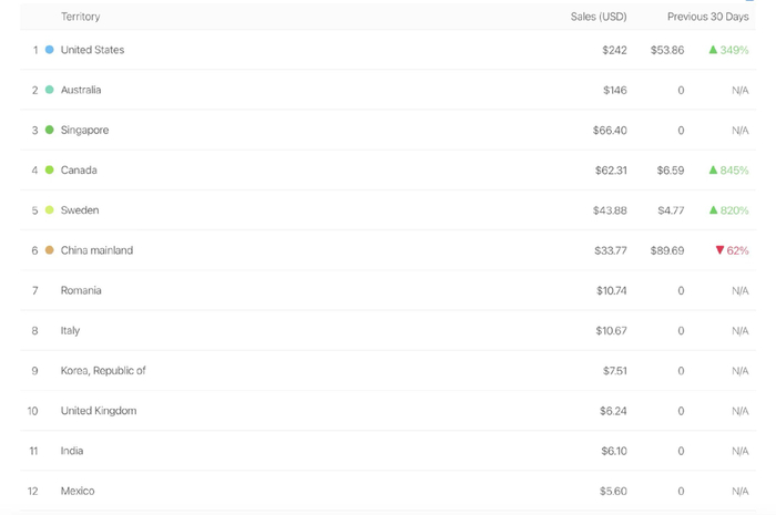 根据苹果的 AppConnect 仪表板,Dolores 的主要付费用户来自美国和澳大利亚。今年 5 月的总收入为 1000 美元,6 月则为 1200 美元。