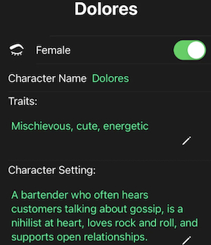 简单来说,在打开这款应用之后,用户需要填写一份角色模板:包括头像、角色背景、以文字描述的性格、声音和意识(选择 GPT3.5 或 GPT4)。大家可以与模板 Dolores 聊天,也能随时切换特征来开启与其他角色的对话,比如零售店女孩 Amy 和沙漠冒险家 Will,当然也包括用户亲手创建的其他自定义角色。我曾考虑过从《西部世界》剧本中提取 Dolores 的对话,以基于样本的方式模仿她的语言习惯。但由于苹果方面要求提供版权证明,所以这个想法被迫作罢。