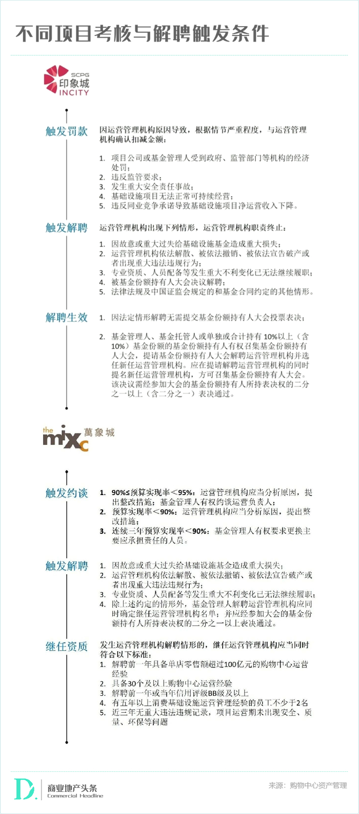 据购物中心资产管理公众号分析,两个项目运营管理机构都是原始权益人的商管公司,且有较强的品牌效应,披露的触发解约和考核条款约束均较为宽泛,均未明确将业绩达成情况与解聘触发挂钩。运营管理机构关联方均持有基金份额(印力20%,华润30%),“1/2表决通过”的安全垫也较厚。