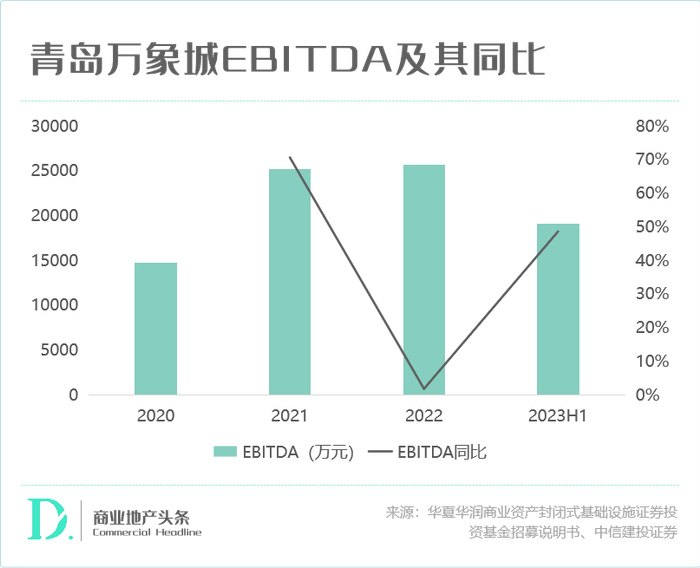 虽2020年、2022年因分别减免租金3336.63万元和8823.22万元造成营收降低,但随着疫情防控政策调整,2023上半年营收同比增速回正至30.1%至3.31亿元,其中租赁收入占比稳定在70%以上。疫情期间项目EBITDA维持正增长,今年上半年实现EBITDA1.9亿元,同比增长49%。