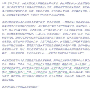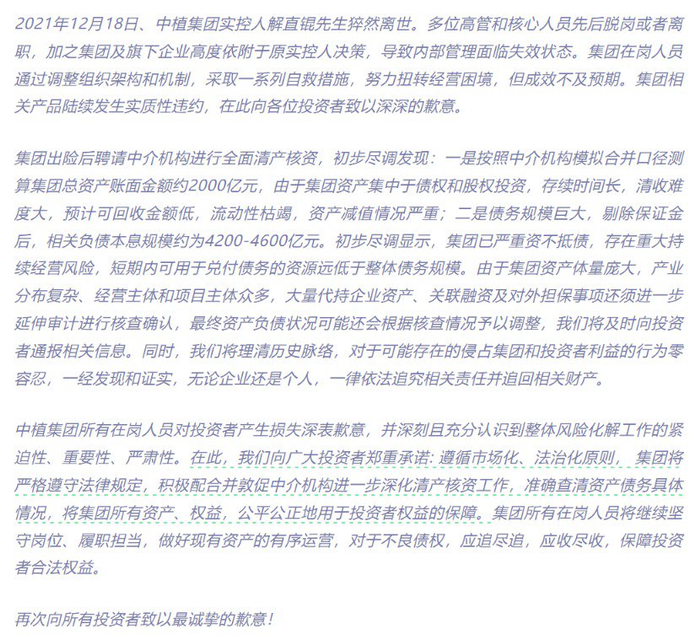 中植集团在信中表示,初步尽调显示,中植集团已严重资不抵债,存在重大持续经营风险,短期内可用于兑付债务的资源远低于整体债务规模。“集团相关产品陆续发生实质性违约,在此向各位投资者致以深深的歉意。”