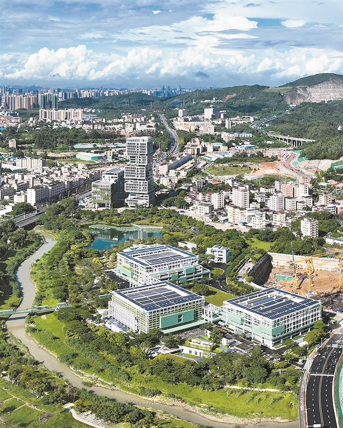现在的深圳国际低碳城是唯一以绿色低碳为核心定位的市级重点发展片区,成为展示我国绿色低碳发展成果的重要窗口。同时,它也为龙岗低碳产业高质量发展不断探路,在这里,国内首创微藻固碳生态氧吧系统将绿色健康环境带进室内;储能系统、磁悬浮空调、光储充电桩等总计120项技术合力缔造国内首个“近零能耗”场馆;深圳首条氢能大巴示范体验线在此启程……