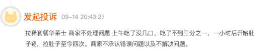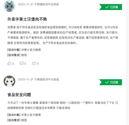 在黑猫投诉上,也有不少人吐槽华莱士的卫生问题,例如在脆皮鸡中发现毛发、汉堡肉不熟、鸡肉卷中有塑料片等等。