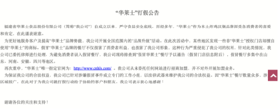 新浪科技在网站上搜索到了不少华莱士的加盟广告,但华莱士的官方微博和网站都表明,自己从未开放加盟。