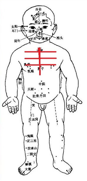 第一个字是“丰”。在孩子的前胸,沿着胸骨从上到下先完成第一笔竖,然后,沿着肋间隙,从上到下,两侧各来三笔,凑一起组成三横。可以用食中指,在皮肤上推擦30-50遍,至皮肤微微发红,也可以用刮痧板在皮肤上轻刮。三横一竖加起来,就组成一个“丰”字,每天睡前一次,能起到宽胸理气,止咳化痰,降逆止呕的作用。