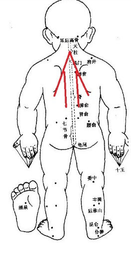 “天河水”是小儿推拿手法中常用的清热穴位,该穴位位于前臂内侧正中,自腕横纹至肘横纹成一直线,用食中指弹打天河水有很好的退热作用。三穴合用,有清肺止咳清热的作用。同时为了增强退热效果,又给孩子加上了后背刮痧。