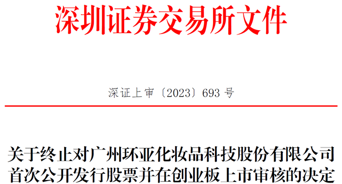 深圳证券交易所于2022年12月31日依法受理了环亚科技首次公开发行股票并在创业板上市的申请文件,并依法依规进行了审核。2023年11月20日,环亚科技向深交所提交了《广州环亚化妆品科技股份有限公司关于撤回首次公开发行股票并在创业板上市申请文件的申请》,保荐人向深交所提交了《中信证券股份有限公司关于撤回广州环亚化妆品科技股份有限公司首次公开发行股票并在创业板上市的申请》。根据《深圳证券交易所股票发行上市审核规则》第六十二条的有关规定,深交所决定终止对环亚科技首次公开发行股票并在创业板上市的审核。