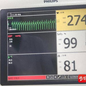 25日下午,这名刚出生22天的宝宝转到淮安市第一人民医院时就表现出一系列症状,吃奶时气喘,精神萎靡,轻微单声咳,气喘逐渐加重,胸片显示左肺纹理增粗,边缘模糊。医院于是以“新生儿肺炎”将其收住入PICU儿童重症监护室治疗,后查心电图提示心室率300次/分,P波辨认不清,被诊断为持续性室上性心动过速。