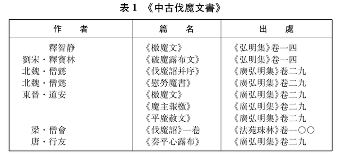 关于中古几篇伐魔文书,学者认为其中几篇是假托的,从清代学者严可均到日本学者牧田谛亮都认为其中有一部分是伪托的,本文则认为其中仅有署名道安的《檄魔文》是伪托的,其他各文的作者都没有问题。此处先将见诸记载的伐魔文书的作者列表说明如下: