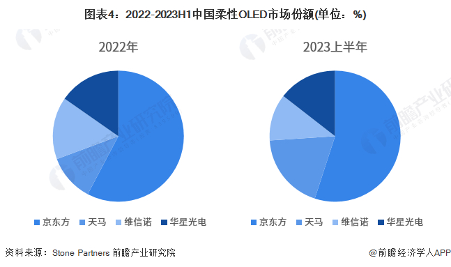 从柔性OLED面板出货企业来看,中国柔性OLED面板市场集中在少数企业手中,主要包括京东方、天马、维信诺和华星光电。2022-2023年,京东方稳坐我国柔性OLED产业头把交椅,市场份额稳定在50%以上。此外,天马柔性OLED产品快速放量,2023年柔性OLED面板份额提升较大。