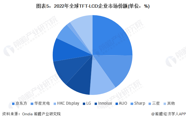 Omdia根据各企业投资动向,对2022年全球TFT-LCD企业市场份额进行测算。2022年全球TFT-LCD企业市场份额占比最多的是京东方,占比25.2%,其次为华星光电,占比为15%,第三是惠科股份,占比11%。
