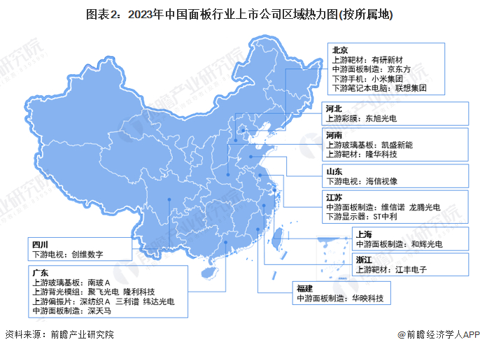 从上市企业区域分布情况来看,面板产业链上中下游企业主要分布在华东和华南地区。其中中游面板制造企业主要分布在北京、广东、江苏等地。