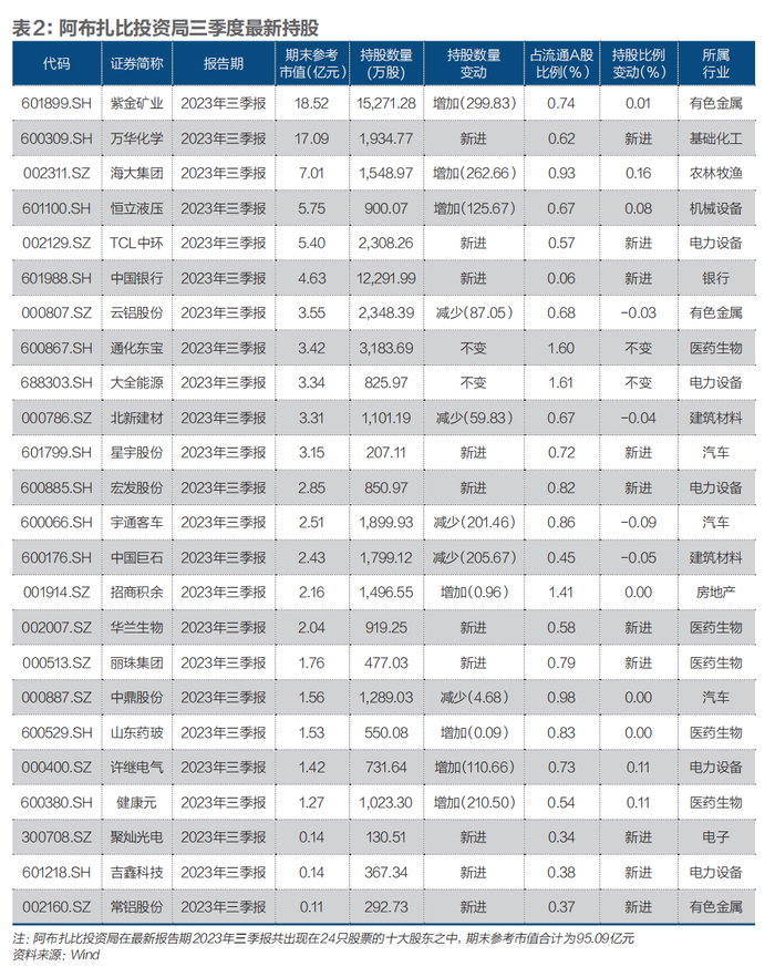 持仓市值方面,紫金矿业成为阿布扎比单笔持仓最大的公司,截至三季度末,持仓参考市值为18.52亿元;其次是万华化学,三季度末持仓17.09亿元。