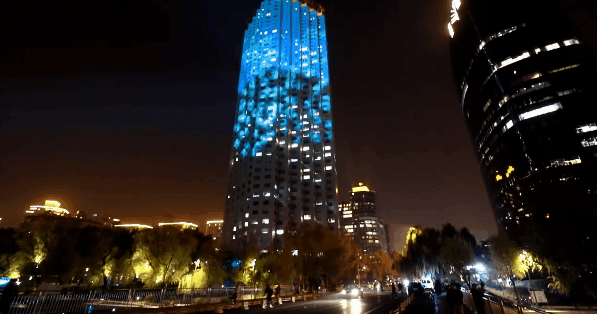 沿凯宾斯基广场向西900m,步行约15分钟,在京城大厦设置有投影表演。斑斓色彩在城中跳跃,趣味的水滴幻化出万千形态,嬉戏于楼宇,艺术化地展现出现代人对都市生活的热情。
