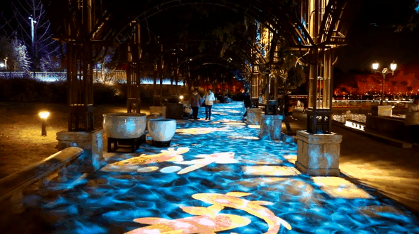 从新源街桥沿着三里屯路一路步行向南,在1.4公里长的漫步花影路的引导下,沿途欣赏悦见祥瑞、飞鱼海洋、繁花梦境、海洋梦境等灯光场景,漫步在浪漫唯美的鲜花、落叶的光影梦境中。