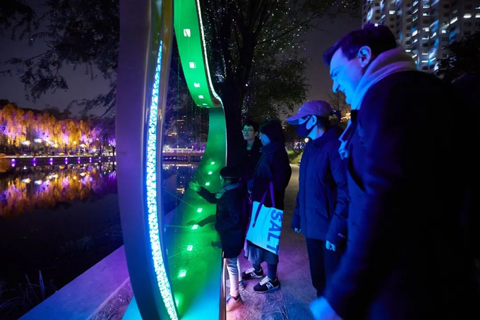 在朝阳公园“天鹅之家”沿岸,一面风动矩阵墙形式的灯光节主题海报映入眼帘,每周六晚,墙体正面会布满璀璨晶莹的发光玫瑰花,来到这里打卡的游人可以摘下一朵留念,将灯光节的满满祝福带回家。