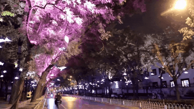 再去往第二使馆区的路上,就是一片“飞鱼海洋”,只见三里屯路两侧高大的杨树上挂满了多彩而晶莹剔透的“飞鱼”灯,有蓝的鲸鱼,也有红的锦鲤,行走在树下,如同漫步于海底世界,神秘而浪漫。