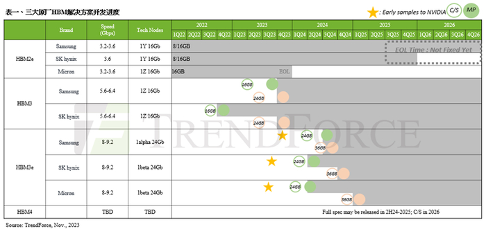 而HBM3e方面,美光已于今年7月底提供8hi(24GB)英伟达样品,SK海力士已于今年8月中提供8hi(24GB)样品,三星则于今年10月初提供8hi(24GB)样品;预计他们将在2024年第一季完成HBM3e产品验证。