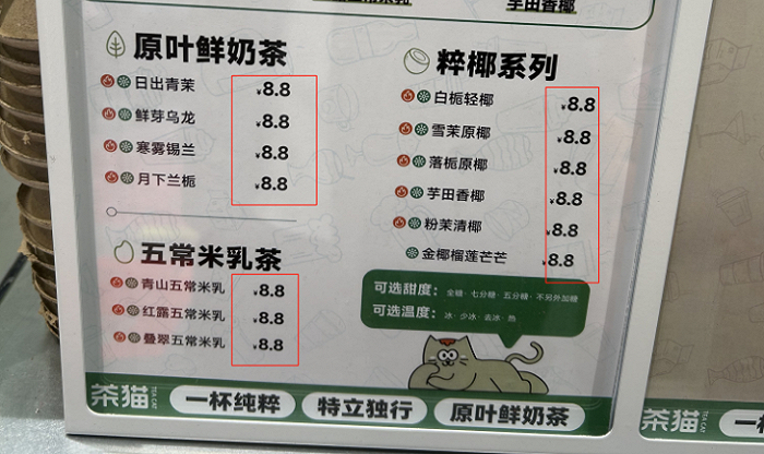 价格是茶猫最大的话题点。菜单上全系产品标价8.8元/杯,第二杯半价,相当于最低6.6元/杯,比之前行业传闻的6.9元还要低。