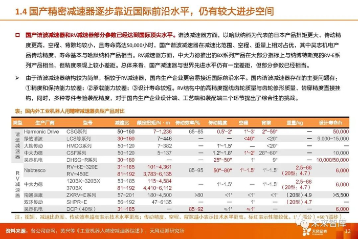 国产谐波减速器和RV减速器部分参数已经达到国际顶尖水平。谐波减速器方面,以哈默纳科为代表的日本产品扭矩更大、传动精 度更高,空程、背隙均较小,且寿命高达50,000小时,国产谐波减速器在减速比范围、空程、重量上相对占优,其中昊志机电产 品传动精度、寿命基本与哈默纳科产品相当。RV减速器方面,中大力德推出的BX系列产品在大部分指标上与纳博特斯克的RV-E系 列产品相当,但精度表现上较小差距。总体来看,国产减速器与世界先进水平仍有一定差距,但部分参数已经相当。