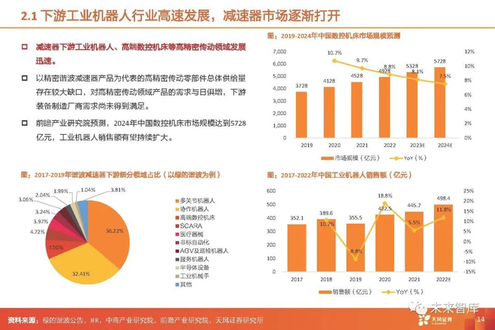 减速器下游工业机器人、高端数控机床等高精密传动领域发展 迅速。 以精密谐波减速器产品为代表的高精密传动零部件总体供给量 存在较大缺口,对高精密传动领域产品的需求与日俱增,下游 装备制造厂商需求尚未得到满足。 前瞻产业研究院预测,2024年中国数控机床市场规模达到5728 亿元,工业机器人销售额有望持续扩大。