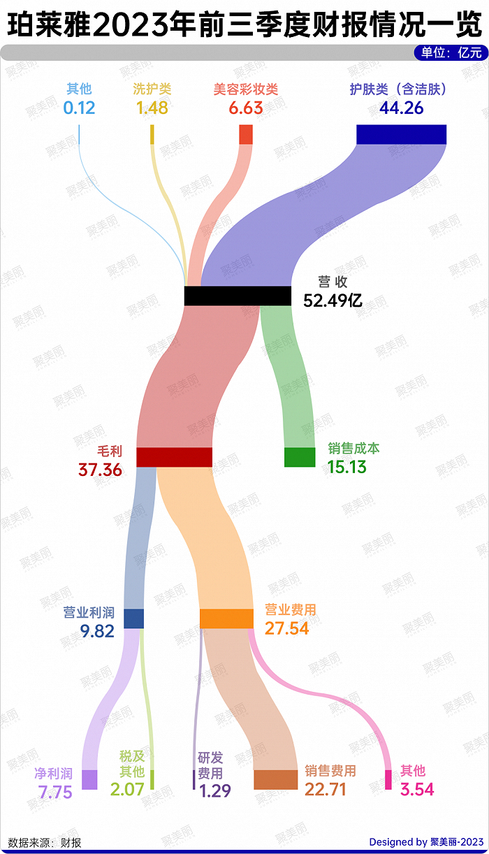 此外,这52.49亿元营收中,毛利占据37.36亿元,毛利率为69.29%,15.13亿元则是珀莱雅今年前三季度的销售成本。具体去看毛利,其中营业费用高达27.54亿元,占营收的73.7%,营业利润为9.82亿元,扣去2.07亿元的税及其他,净利润为7.75亿元,同比去年增长53.8%。