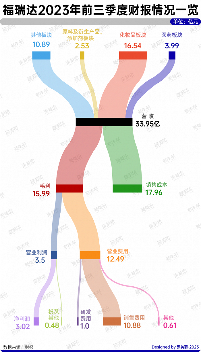 据财报显示,今年福瑞达前三季度营收为33.95亿元,同比下滑60.20%,归母净利润同比增长54.79%为2.38亿元。其中,主要业务可分为医药板块,化妆品板块,原料及衍生产品、添加剂板块,其他板块四个部分。