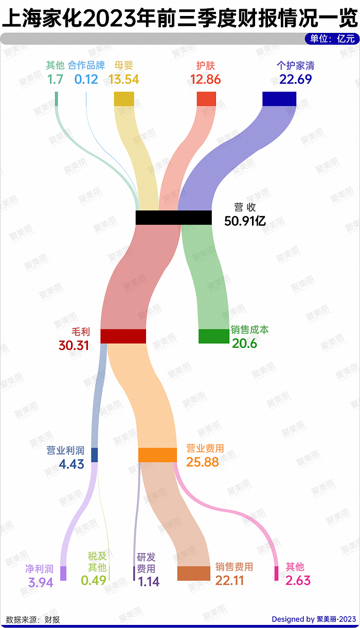 而在上海家化50.91亿元的营收中,20.6亿元为销售成本支出,其余为毛利30.31亿元,即毛利率为59.54%。其中,上海家化前三季度的营业费用高达25.88亿元,销售费用和研发费用各为22.11亿元和1.14亿元,占营收比重分别为43.43%和2.24%;营业利润为4.43亿元,扣去0.49亿元税及其他,净利润为3.94亿元,同比去年增长25.83%。