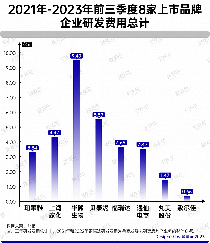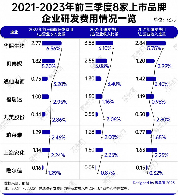 而在敷尔佳今年前三季度的营收结构中,销售成本为2.36亿元,其中销售费用和研发费用分别为3.55亿元和0.16亿元,销售费用和研发费用在今年前三季度国货美妆八强中均为队末。