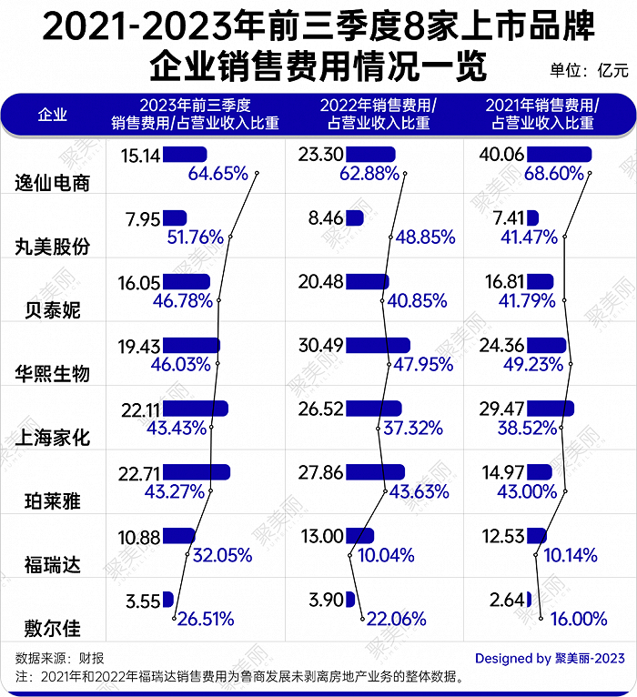 而敷尔佳销售费用占营收比重的上升也只是八家上市品牌企业的缩影。2021年至今年前三季度,丸美股份、贝泰妮、上海家化、敷尔佳的销售费用占营收比重都在稳步提升,其中以丸美股份增幅最大,增幅达到10.29%,逸仙电商则是在高位徘徊,2021年至今年前三季度的销售费用占营收比重分别为68.6%、62.88%、64.65%。