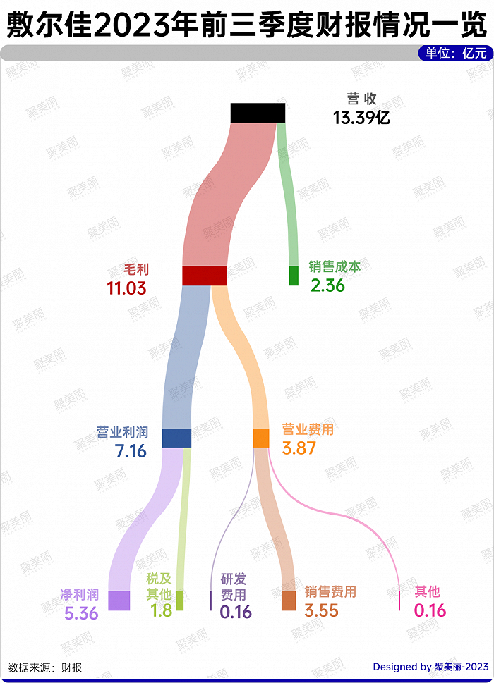 相比之下,今年终于成功上市的敷尔佳,财报数据并不亮眼。据财报显示,2023年前三季度营收为13.39亿元,同比增长1.86%;归母净利润为5.36亿元,同比下滑17.33%。