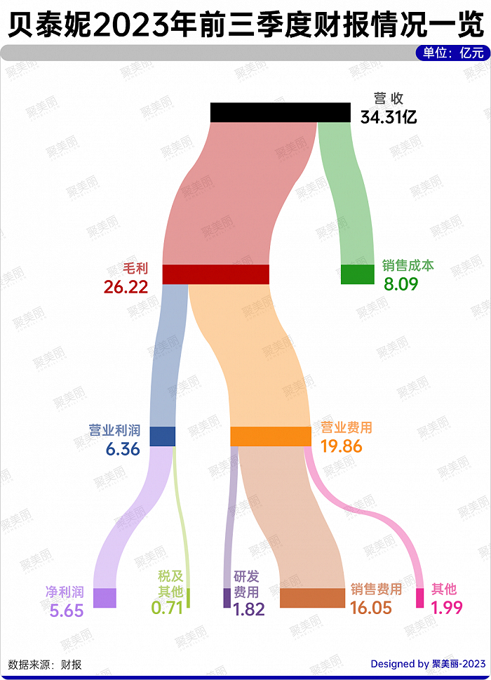 而在贝泰妮今年前三季度34.31亿元的营收中,销售成本占据8.09亿元,毛利为26.22亿元,即毛利率为76.42%,在今年前三季度上市品牌企业八强中仅次于敷尔佳。拆解这26.22亿元毛利,其中运营费用占据19.86亿元,营业利润为6.36亿元,扣去0.71亿元的税及其他,净利润为5.65亿元。
