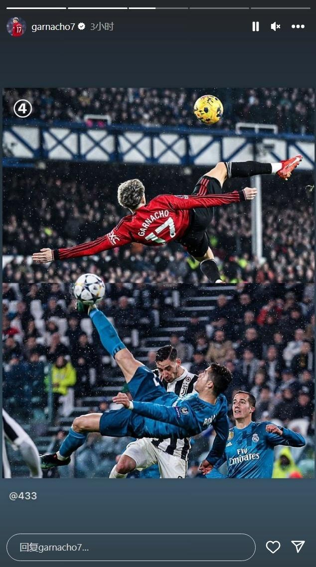 但加纳乔在自己的社交平台上晒出的却不是和鲁尼的对比图,而是自己与C罗惊天倒钩的对比图。 作为C罗的球迷,加纳乔在进球之后,还模仿了C罗标志性的庆祝动作。