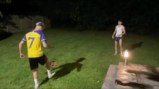 而今年夏天,加纳乔把在家里的草坪上颠球的视频传到网上,视频中可看到,他穿的竟然是C罗在沙特利雅得胜利的7号球衣。