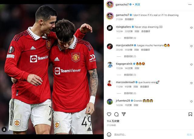 而在去年的一场欧罗巴联赛小组赛的比赛中,曼联3比0完胜谢里夫,18岁小将加纳乔一线队首次首发登场,并且有不俗发挥,那场比赛他和偶像C罗并肩作战,赛后加纳乔也在个人社媒平台晒出了自己与C罗在比赛中的合照,并配文道:“我已经分不清这是现实还是我在做梦了。”