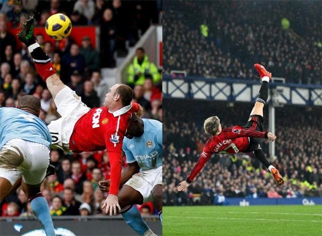 说回到这场比赛,比赛开始仅仅2分多钟,加纳乔接达洛特的传中球,背身腾空而起,右脚倒钩破门,为曼联首开纪录。在2011年2月曼联对曼城一战中,鲁尼也曾以这样的方式破门,而鲁尼的这个进球曾被评选为曼联千场最佳进球。