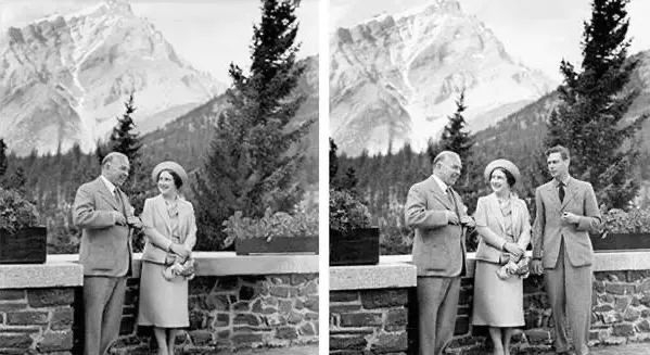 1939 年,英国国王乔治六世携其妻子伊丽莎白王后与时任加拿大总理威廉·莱昂·麦肯齐·金(William Lyon Mackenzie King)合影留念。然而当这张照片用在后来的加拿大总理的竞选宣传上时,却英国国王却神秘“消失”了。
