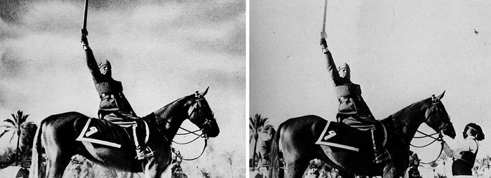 法西斯主义的创始人贝尼托·墨索里尼(Benito Mussolini)将驯马师从原始照片中删除,据说是为了让他显得更加英勇。