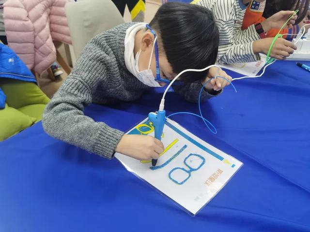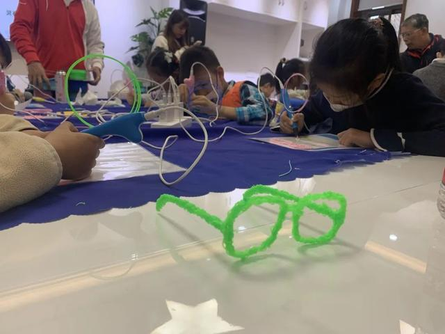 现场,不少家长陪着孩子参加活动。一位幼儿园大班的小女孩告诉记者:“我做的是眼镜框,是用3D打印笔做的,很有意思,而且是可以戴的。”