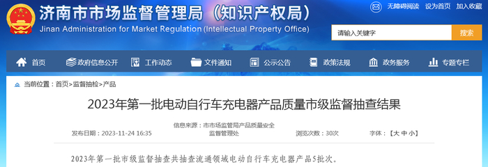 济南市市场监督管理局公布2023年第一批电动自行车充电器产品质量市级监督抽查结果