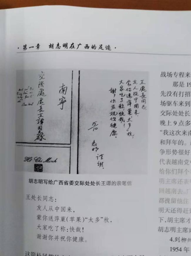 在外事处的5年多时间里,父亲承受了大量繁重的外事工作,多次与越南和东南亚的革命领导接触,留下了深厚的友谊。1950年10月中旬,父亲托人将一箱苹果送给胡志明主席,胡主席收到之后十分高兴,将苹果派给身边的同志,让大家共同分享。10月15日,胡志明主席用汉文写了一封亲笔信,托人带给交际处处长王谭。信中写道:致处长同志,友人从中国来,蒙你送萍果(苹果)“太多”枚,大家吃了称快哉!谢谢你并祝你健康。胡志明主席还给了父亲一张自制的名片。父亲与越南人民结下了深厚的感情。
