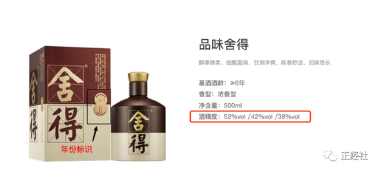 但需要注意的是,年份酒并不等同于老酒,业内约定俗成的是需要同时满足“5年以上”、“45度以上”两个条件才能称得上真正的老酒。而舍得酒除了45度产品之外,还有42度、38度两个度数。