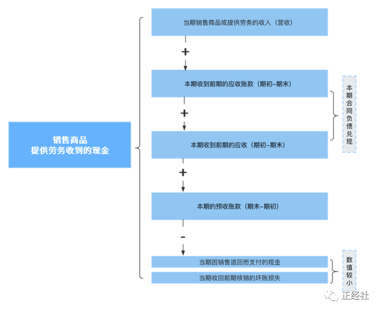 根据财政部发布的《企业会计准则—现金流量表》指南,企业的“销售商品、提供劳务收到的现金”=“本期销售商品、提供劳务收到的现金”+“本期收到前期的应收账款”+“本期收到前期的应收票据”+“本期的预收账款”-“本期因销售退回而支付的现金”+“本期收回前期核销的坏账损失”。