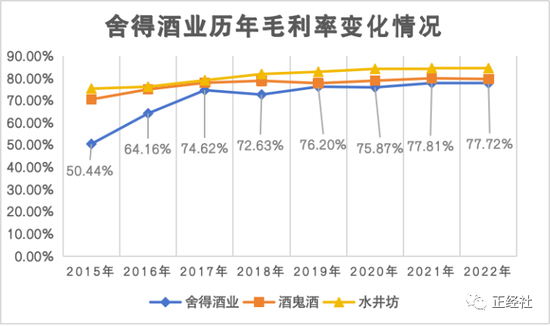 刺激舍得酒业大张旗鼓突击高端的,是行业不断升级过程中,舍得酒业逐渐落后的行业地位。从毛利率来看,2015年以来,舍得酒业的毛利率虽有所增长,但对比隔壁兄弟水井坊和远方友商酒鬼酒还存在差距。