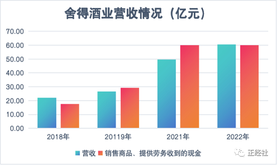 到了2022年,舍得酒业销售商品、提供劳务收到的现金和营收,则分别为60.14亿元、60.56亿元,尽管已是相差不大,但后者又反过来大过了前者。