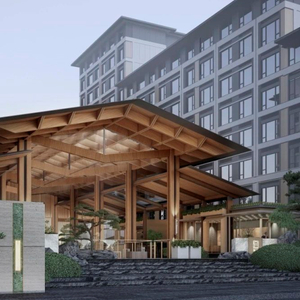 社区界面革新。入口设置了木头房子,木头房子里边是一个既有商业功能,又有服务功能的双层庭院。首层是服务区,包含了茶饮果汁、咖啡甜点、品质早餐、水果小食四个业主独享放松的小盒子;下层是商业区,既能买菜逛市场,也拥有小型的商服区,是个对外开放的小型社区mall,把部分城市功能引渡到了社区内部。