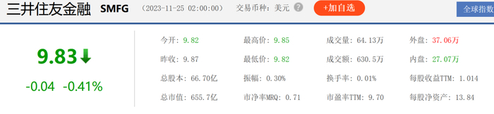 三井住友金融集团于2010年11月在纽交所挂牌上市,最新市值为657亿美元(超4000亿人民币)