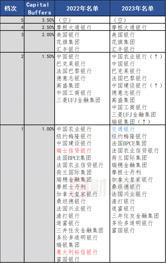 顾名思义,反映全球最重要银行的名单,一般不会发生剧烈的变化。2023年全球总共有29家银行上榜,数量上较去年少了一家,瑞士信贷和意大利裕信银行被移出了今年的名单,(中国)交通银行上榜。另外,还有数家银行的档位发生了变化。