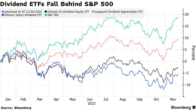 景顺(Invesco)的Nick Kalivas表示,PFM业绩落后与该公司减持所谓的“七巨头”(Magnificent Seven),增持甲骨文(Oracle Corp.)、思科系统(Cisco Systems Inc.)和IBM等“成长性”较弱的科技公司有关。ProShares表示,尽管今年标普500指数的整体盈利出现下滑,但该公司的业绩表现“基本良好”,平均盈利仍在增长。道富银行(State Street)的马特•巴托里尼(Matt Bartolini)指出,高股息策略存在“价值偏见”,而2023年是一个“成长型市场”。先锋集团(Vanguard)和贝莱德(Black Rock)拒绝置评。