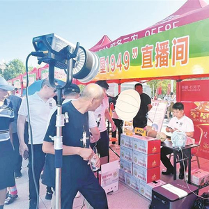 在八师一二一团第四届“炮台红”甜瓜节活动现场,工作人员在“军垦1949”区域品牌直播间进行直播带货(摄于7月15日)。 兵团日报全媒体记者 赵优 提供